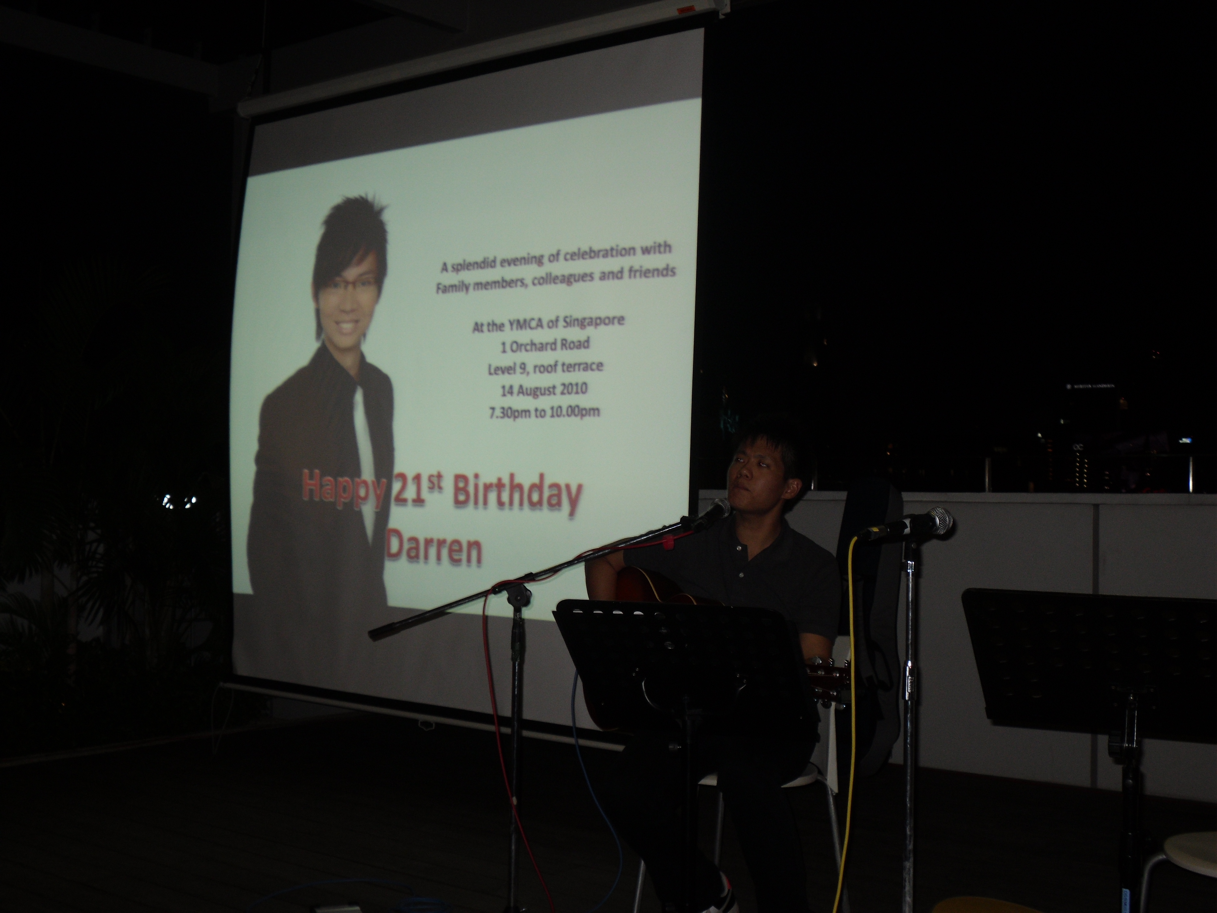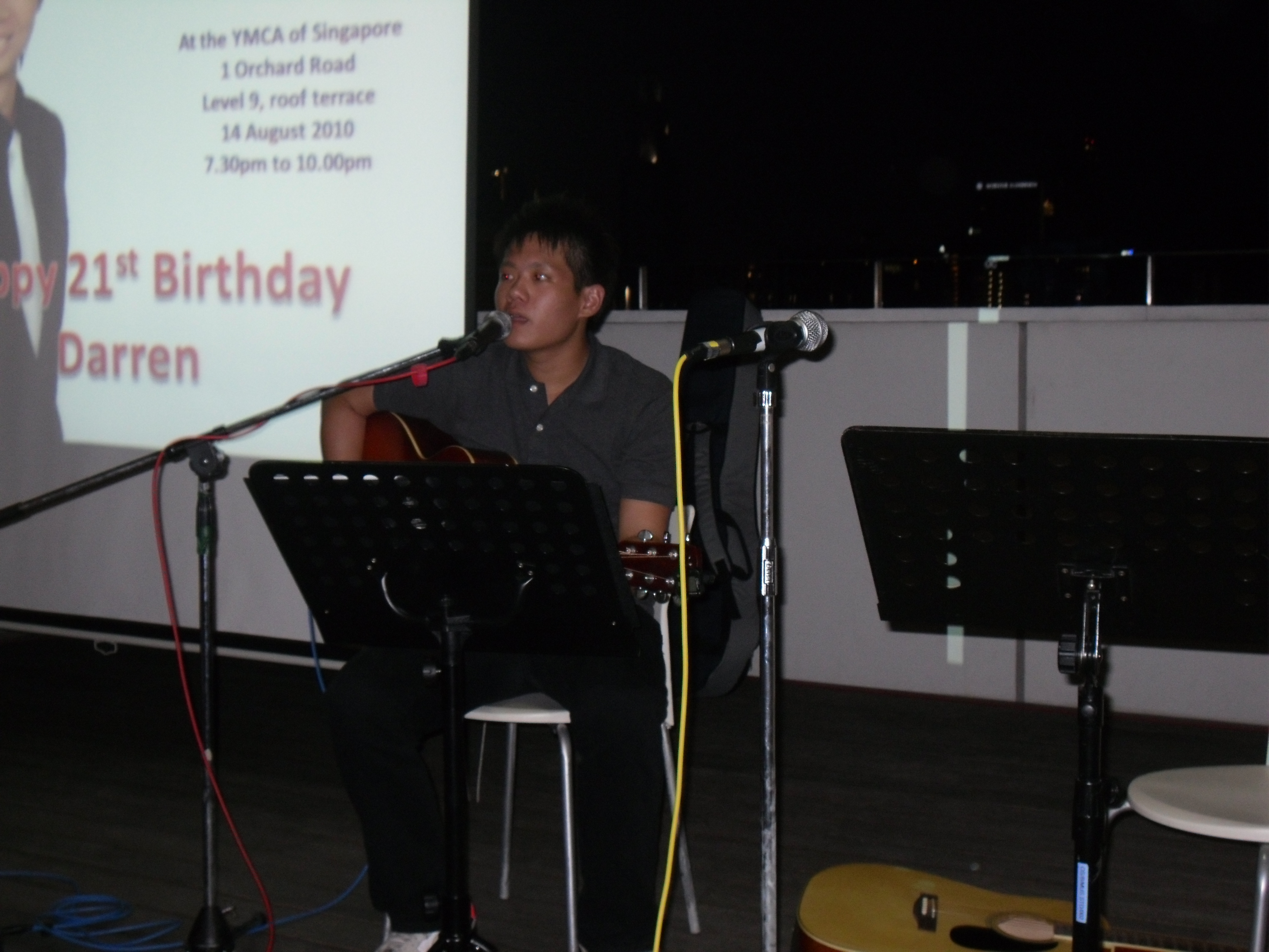 Darren’s 21st Birthday Posted on August 14, 2010 by redkitemusic Darren Tay, champion speaker of Toastmaster’s club, held his 21st birthday party at YMCA Rooftop terrace. Louis Illias, an old boy of mine (used to manage him personally), had made a comeback with this gig. Share this: Click to share on Facebook (Opens in new window) Facebook Click to share on X (Opens in new window) X Like Loading...