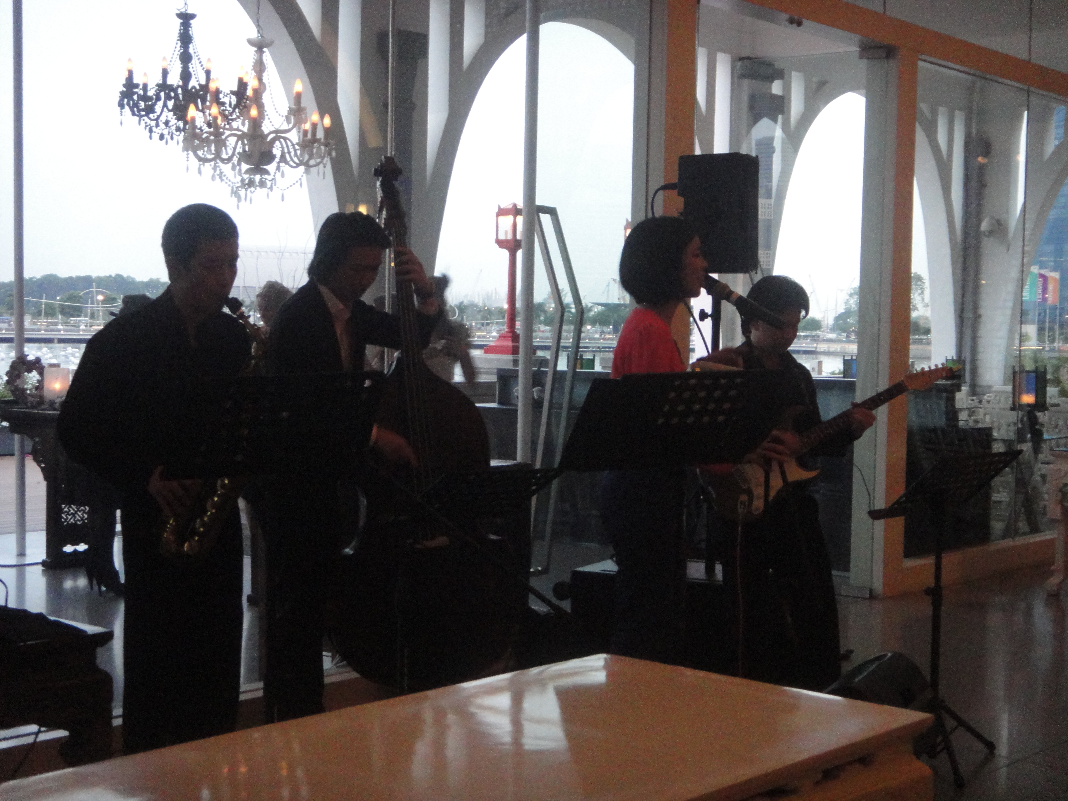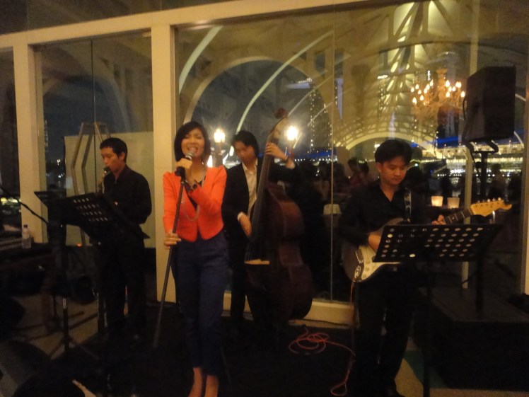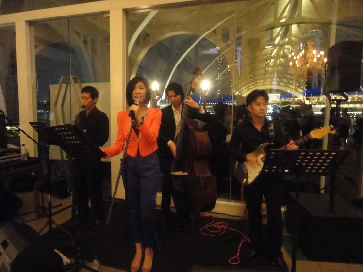 The ladies and gents all dressed up to the nices 😉 enjoying the evening with some jazzy tunes and a couple of Christmas favourites by Sarah Cheng and her band, which includes a Saxophonist (Alvin Ang), a double Basist (Titus Ng) and an electric Guitarist (Justin Low).