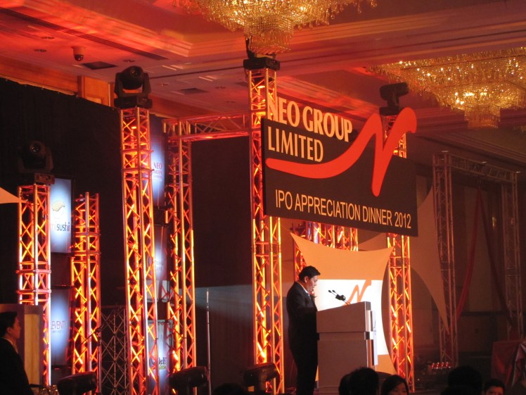 Tonight, Tower Ballroom at Shangri-la was bustling with people and elaborate set ups. Neo Group celebrates its public listing on the SGX. Another humble to riches story, as they started out with only 8 staff and now they have 400+ staff (overheard).